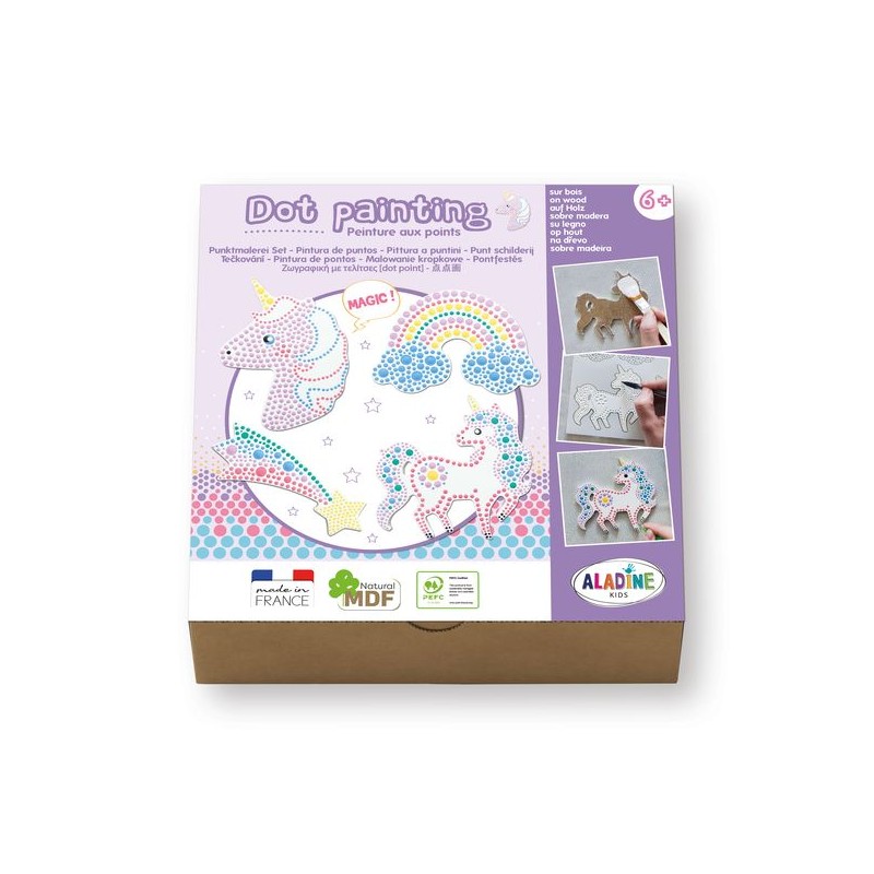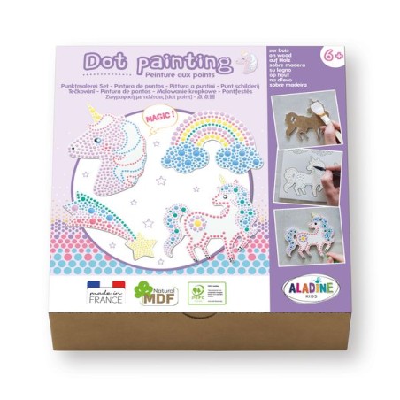 Le coffret Dot Painting Licorne permet aux enfants de s’initier à la décoration créative en découvrant une nouvelle activité tendance, le Dot Painting : peindre avec des points. Ce coffret, permettant de réaliser 4 créations en points de peinture, est une activité à la fois créative et apaisante. Peignez chaque forme pour la colorer de la couleur de votre choix. Faites ensuite les points à l’aide du pochoir et du critérium, puis appliquez la peinture avec les outils de Dot painting permettant de réaliser différentes tailles de points. La peinture et le bois respectent les exigences réglementaires en matière de sécurité (norme jeux/jouets EN71). Les formes à décorer sont en MDF naturel et biosourcé certifié PEFC produit en France. Cette activité est non seulement amusante mais aussi éducative, car elle permet aux enfants de développer leur motricité fine et leur sens de la créativité. Ce coffret fabriqué en France contient 4 formes en medium, 1 pochoir, 8 couleurs de peinture, un critérium, 3 outils pour réaliser les points et 1 pinceau.