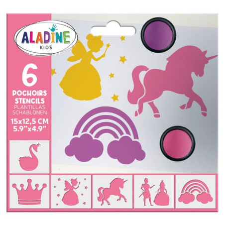 Kit de 6 pochoirs enfant de 15*14 cm sur leur thème préféré : les princesses. Couronne, prince charmant, arc en ciel, cygne, princesse… ils vont adorer dessiner, peindre ou réaliser avec les encreurs minos de jolis dessins sur des supports papier, textile ou bois, à customiser selon leurs envies