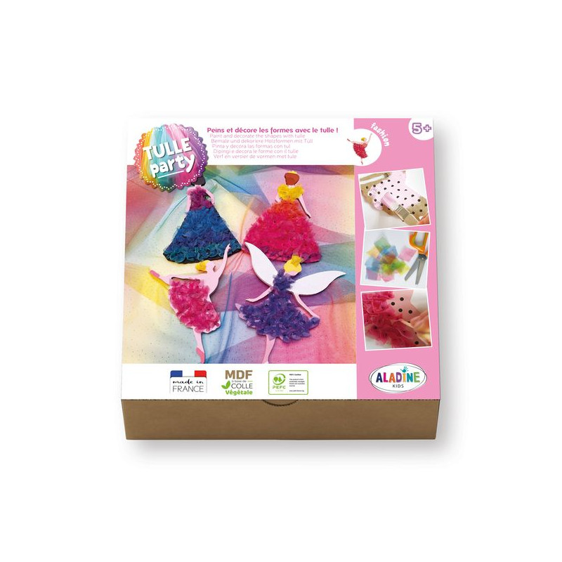 Les Coffrets Tulle Party d'Aladine sont l'occasion rêvée pour les enfants de laisser libre cours à leur créativité en intégrant du tulle dans des formes originales ! Avec cette activité ludique et captivante, ils pourront ajouter une touche magique de tulle à leurs créations et transformer leurs décorations en réalisations aussi belles qu'originales. Peindre, découper, et laisser le tulle sublimer leurs œuvres deviendra un jeu d'enfant. Prêts à voir vos enfants devenir de véritables artistes du tulle ? Un concept simple et amusant :Avec Tulle Party, les enfants réalisent leurs créations en seulement trois étapes faciles :1- Peindre les supports en bois avec la peinture couvrante incluse (une seule couche suffit pour un rendu éclatant).2- Découper le tulle multicolore en carrés de 2 à 3 cm, selon leur inspiration. 3- Insérer les morceaux de tulle dans les trous à l’aide du bâton bois (diamètre 2,5 mm). Cette étape peut être réalisée directement sur le carton de la boîte ou sur une surface souple. Ces supports plus mous facilitent l’insertion du tulle dans les trous et aident à le maintenir en place. Enfin, en séchant, la peinture assure une fixation durable du tulle à l’intérieur des trous.Le tulle dégradé et pailleté apporte un effet raffiné et féerique à chaque création, rendant chaque forme décorée colorée, élégante et unique.Chaque coffret contient tout le nécessaire pour réaliser de magnifiques créations :4 formes en bois : jolies robes glamour et élégantes à décorer.1 pinceau large: idéal pour peindre facilement et adapté à la largeur des godets.1 barrette de peinture :8 Couleurs : blanc, noir, rose, violet, bleu, vert, marron et jaune. Peinture de haute qualité, couvrante et simple à utiliser.Du tulle dégradé arc-en-ciel et pailleté : Dimensions : 25 x 160 cm.2 outil en bois : d’un diamètre de 2,5 mm et 3 mm parfait pour insérer le tulle facilement.