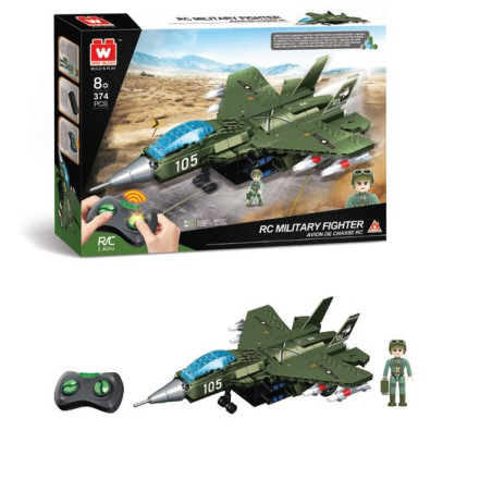 Développe ta créativité et dextérité tout en t’amusant avec ce coffret de briques de construction radiocommandé Wise Block. Assemble les 374 pièces pour construire ton avion de chasse radiocommandé, accompagné de sa figurine militaire !L’avion de chasse roule : marche avant, arrière, tourne à gauche et à droite à l’aide de la télécommande;La figurine militaire est articulée, avec ses accessoires (casque, lunettes, mallette) inclus.1 planche de stickers de personnalisation fournie.Télécommande multi-directions 2.0Technologie 2,4 GHzDimensions produit monté : L28 x P20 x H9 cmHauteur figurine : 5,5 cmDimensions packaging : L41 x P6 x H30,5 cm