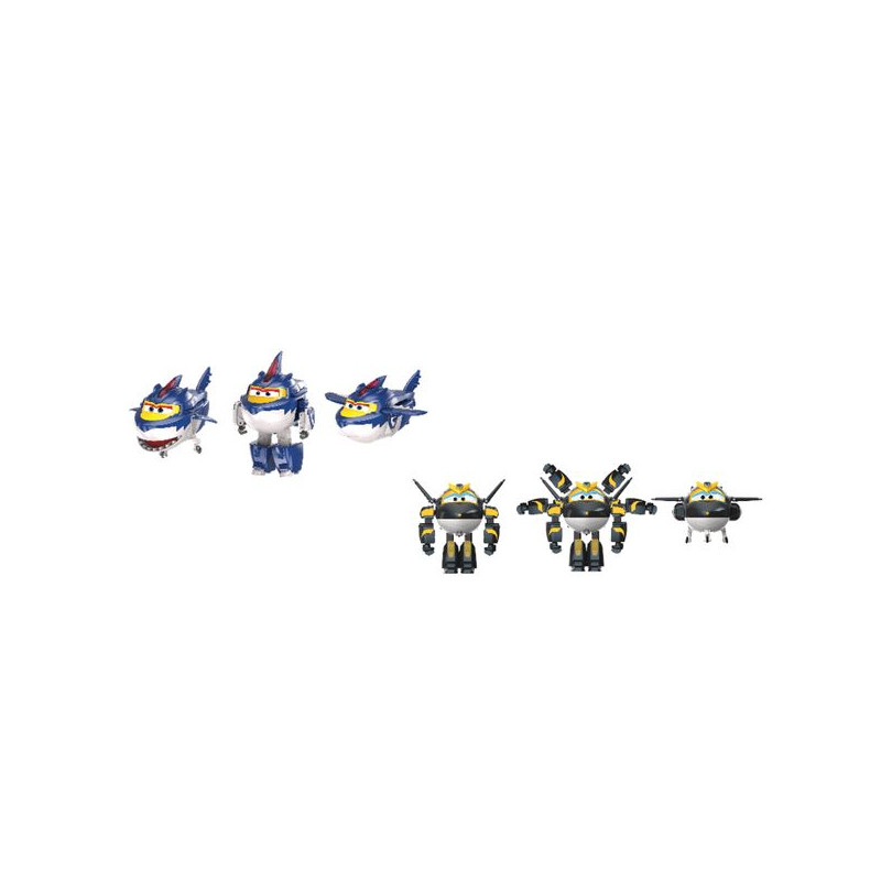 Entre dans l’univers des Super Wings et recrée chez toi les aventures de tes personnages préférés, issus de la série TV ! Pack de 2 Figurines Transformables 12 cmDARK FLIGHT GOLDEN BOY & SHARK : Prêts pour l’action ultime !DARK FLIGHT GOLDEN BOY offre 2 modes de jeu et 13 étapes de transformation pour des missions toujours plus impressionnants.En mode robot, il peut déployer une silhouette à 6 bras et proposer 4 styles de paumes différents pour varier les attaques.Et ce n’est pas tout : ses 4 bras combinés se transforment en double réacteur, pouvant s’intégrer à son mode avion.Avec 2 formes et 8 étapes de transformation, SHARK redonne vie au look animé du nouveau personnage de la Saison 10..Appuie sur sa nageoire pour déclencher l’action : sa mâchoire se met à mordre pour un effet encore plus réaliste !Un duo explosif pour des aventures XXL !
