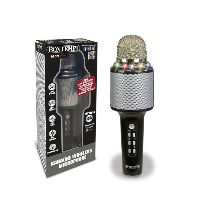 Microphone karaoké sans fil • FONCTION VOCALE KARAOKÉ ON/OFF : reproduisez vos chansons préférées et désactivez la voix originale. MAINTENANT, vous êtes le chanteur/la chanteuse ! • Réglage volume du micro • Effet écho • Effet transformation de la voix • Vous pouvez écouter de la musique/du son en mode wireless (Bontempi4851) à partir d'un smartphone, d'une tablette, d'un PC/Ordinateur portable, etc. ou d'une carte Micro SD (non fournie) • Réglage du volume de la chanson en cours de lecture • Touches de sélection de la chanson précédente/chanson suivante • Prise pour source musicale externe (lecteur MP3, smartphone etc.) - câble inclus • Prise USB Type-C pour câble de charge (inclus) • Effets lumineux • Dim.: 65x215x65 mm