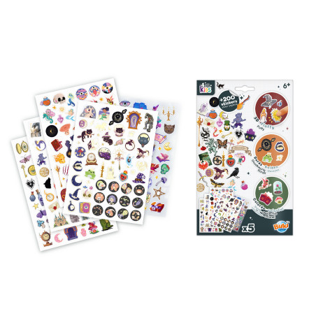 Plus de 200 stickers sur le thème des univers fantastiques et féériques. Des stickers potions, grimoires, dragons, licornes, baguettes, animaux mystérieux et bien d'autres encore !La pochette contient 5 feuilles au format A5 : 3 planches colorées, 1 planche aux contours dorés et 1 planche avec des stickers fluffy (doux et épais).Colle tes stickers sur tes cahiers, tes dessins ou sur tes objets préférés. Dès 6 ans.