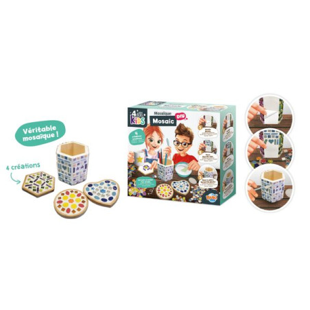 Découvre l'art de la mosaïque avec ce coffret, contenant de véritables morceaux de céramique pour créer un pot à crayons et 3 dessous de verre !Décolle l'adhésif double face de l'objet en bois, place les morceaux de mosaïque, prépare et ajoute le plâtre et laisse sécher.Le coffret comprend un assortiment de mosaïques colorées et variées, 300 g de plâtre, un pot à crayons à customiser, 3 dessous de verre en bois, ainsi qu’un bol, une éponge et 1 spatule de nettoyage pour les finitions.Notice illustrée en couleurs.Dès 6 ans.