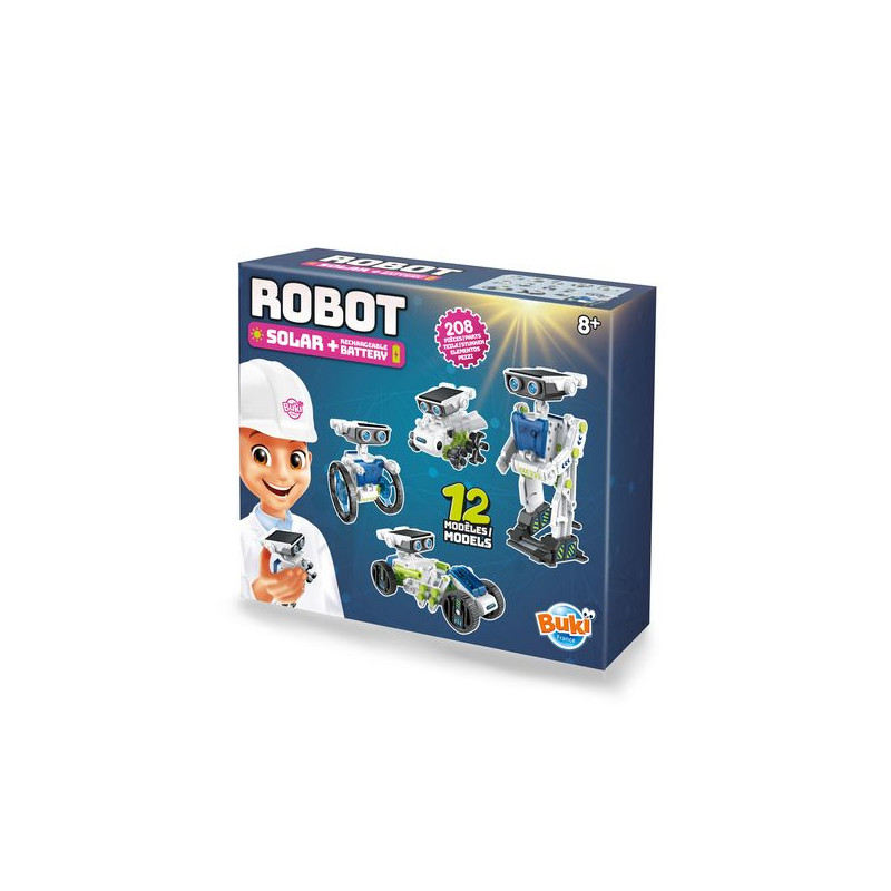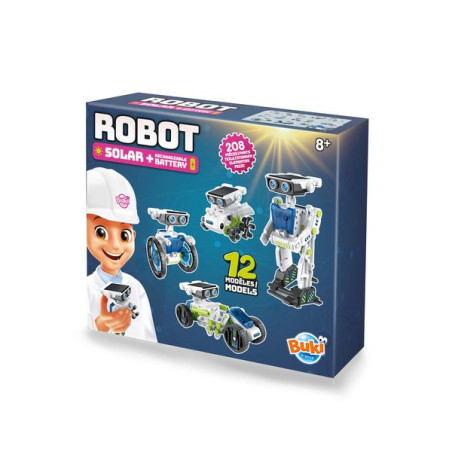Assemble un à un les 12 modèles de robots proposés qui avancent grâce à l’énergie solaire !Double alimentation : utilise le panneau solaire pour actionner les robots au soleil ou la batterie lithium (incluse) pour continuer à jouer les jours de pluie !Nombre de pièces: 220.Notice illustrée en couleurs avec schémas de montage détaillés.Dès 8 ans.