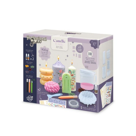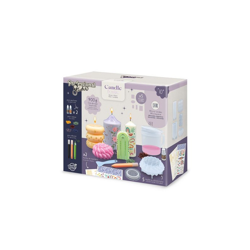 Réalise 5 bougies naturelles à base de cire de soja grâce aux moules en silicone inclus.Ajoute une touche parfumée à tes créations avec les deux flacons de senteurs inclus. Personnalise tes bougies avec des transferts, les fleurs séchées ou en dessinant dessus grâce aux 3 crayons de cire fournis.Utilise le pichet à bec verseur pour faire fondre la cire au micro-ondes facilement et en toute sécurité.Le coffret contient: 5 moules en silicone, 900 g de cire de soja, 5 couleurs en copeaux, 2 planches de transferts, 3 crayons de cire, fleurs séchées, mèches et support.Notice illustrée en couleurs.Dès 10 ans.