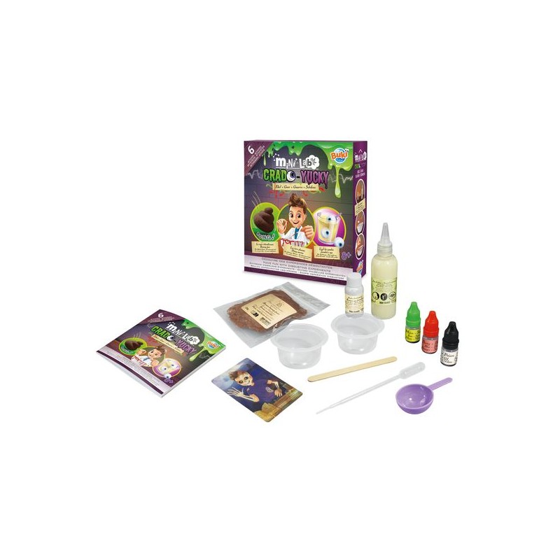 Un coffret pour réaliser 6 expériences dégoûtantes : vers gluants, yeux dégoulinants, crotte rebondissante… Contient : gobelets, pipette, cuillère mesure, alginate de sodium, colorants… Notice illustrée en couleurs. Dès 8 ans.