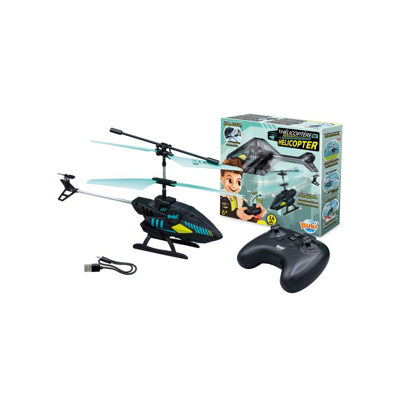 Un hélicoptère télécommandé facile à piloter en intérieur ou en extérieur. L’hélicoptère se stabilise tout seul grâce à son gyroscope intégré. L'hélicoptère mesure 23cm de long. Télécommande 2,4 Ghz.Fonctionne avec une batterie lithium (fournie) qui se recharge par câble USB. Nécessite 3 piles LR03-AAA (non fournies) dans la télécommande. Notice illustrée en couleurs. Dès 8 ans.