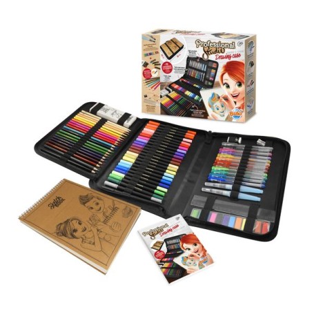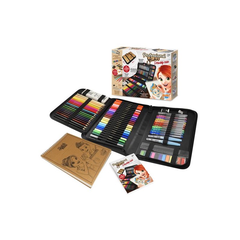 Dans cette pochette à dessin, l’enfant trouvera tout le matériel nécessaire pour développer sa créativité !L’enfant va pouvoir dessiner et aquareller ses œuvres sur le bloc à dessin fourni.Grâce aux 2 pinceaux à réservoir d’eau, il est facile d’aquareller les 12 pastilles de peinture ainsi que les crayons et pastels.Le bloc à dessin se glisse sous les élastiques de la trousse et tout le matériel est rangé dans les compartiments intérieurs. La trousse se ferme grâce à une fermeture éclair et la poignée permet de l’emmener partout !La pochette contient 12 pastilles de peinture, 24 feutres double-embout, 18 crayons de couleurs aquarellables, 8 pastels à l’huile, 12 stylos gel pailletés, 2 crayons de papier HB et 2B ainsi que de nombreux accessoires.Dimensions de la pochette : 23x33cmBloc à dessin : A4 – 35 feuilles détachables – 300gNotice illustrée en couleurs. Dès 6 ans.