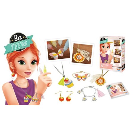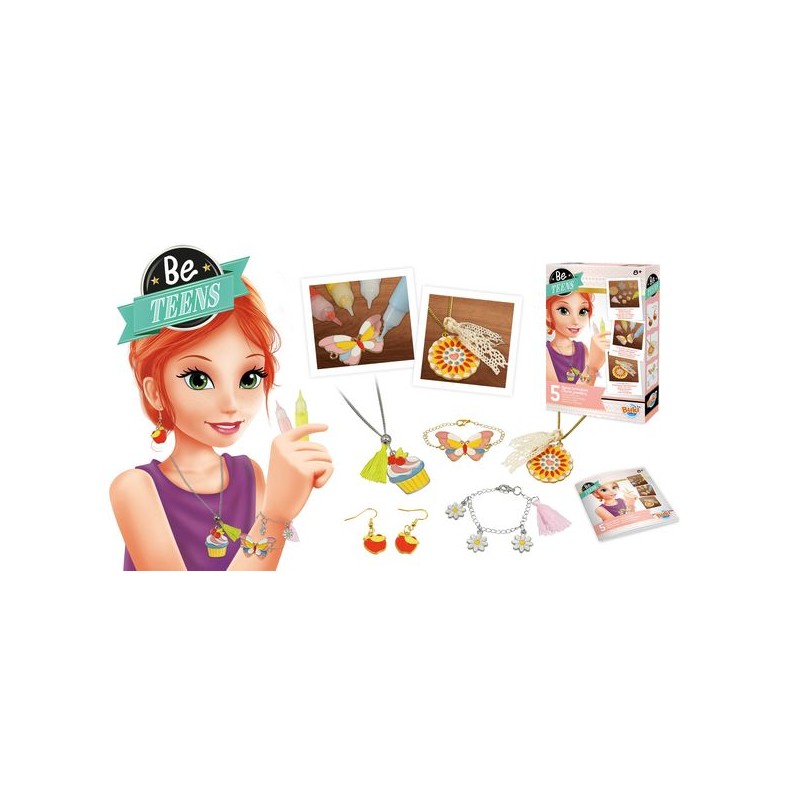Remplis les breloques en métal de peinture pour créer des bijoux colorés ! La peinture sèche à l’air libre.Crée 2 colliers, 2 bracelets et une paire de boucles d’oreilles.Contient : breloques en métal, tubes de peinture, ruban, pompons, perle, chaînettes… Notice illustrée en couleurs. Dès 8 ans.