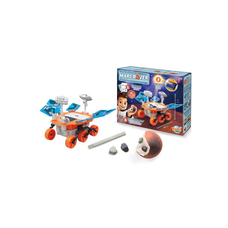 Assemble les pièces pour construire un rover martien. Le véhicule avance grâce à l’énergie solaire, et peut également fonctionner avec une pile LR06-AA (non incluse), permettant de jouer même sans lumière du Soleil. Prolonge ton expédition en creusant un bloc de plâtre pour déterrer quatre roches authentiques – andésite, magnétite, hématite et olivine – semblables à celles découvertes sur Mars par les robots. Dimensions du robot une fois assemblé : 22,5 x 14 cm. Nécessite une pile LR06-AA (non-incluse). Notice illustrée en couleurs avec schéma de montage détaillés. Dès 8 ans