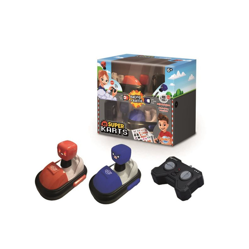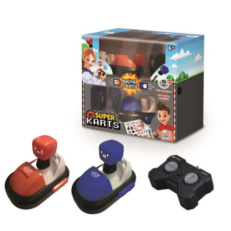 Deux karts à personnaliser pour faire des courses ou s’affronter en intérieur. Deux modes de jeu : Course : créez votre circuit et soyez le plus rapide. Bataille : tamponnez le kart pour éjecter votre adversaire. Télécommande 2,4 Ghz. Portée : 25 m. Fonctionne avec deux batteries lithium incluses qui se rechargent en USB. Nécessite 4 piles LR06-AA pour les radiocommandes. Inclus une planche d'autocollants et une notice illustrée en couleurs. Dès 6 ans.