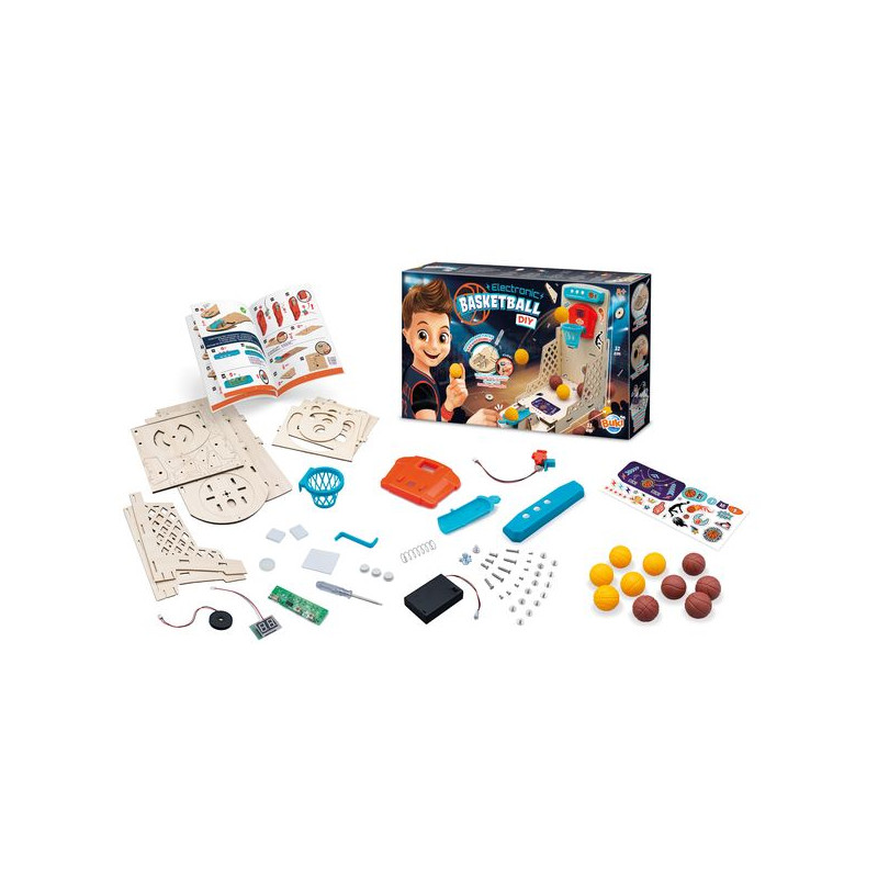 Un coffret pour monter son panier de basket électronique. Avec le tournevis inclus, l’enfant va assembler sans soudure et sans danger: le tableau des scores, le panneau de contrôle, le haut-parleur et le compartiment à piles. Personnalise le panier avec les autocollants. Le tableau électronique émet des sons à chaque panier, décompte le temps imparti et comptabilise les scores. Possibilité de jouer à 2 et de comparer ses scores. Dimension du panier assemblé : 32 x 18 x 32 cm. Trois jeux d’adresse supplémentaires : morpion, tir précis, bataille royale. Nécessite 3 piles LR06-AA non incluses. Notice illustrée en couleurs. Dès 8 ans.