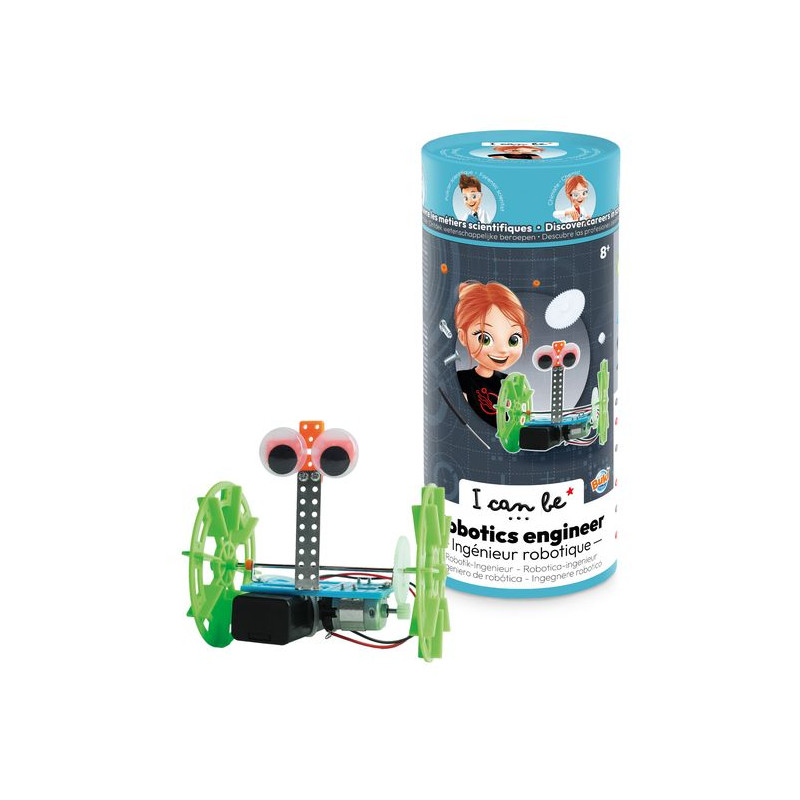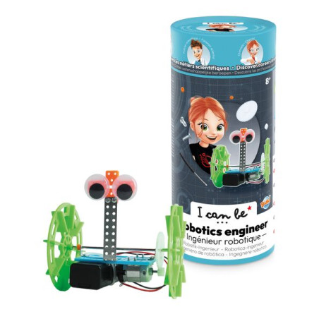Un coffret pour découvrir le métier d’ingénieur robotique. Avec le tournevis inclus, assemble les éléments de ton robot. Connecte le moteur, l’interrupteur et le boîtier à piles. Ton robot se stabilise et avance tout seul. Apprends toutes les techniques des ingénieurs robotiques dans la notice illustrée.Nécessite une pile LR06-AA (non incluse).Dès 8 ans.