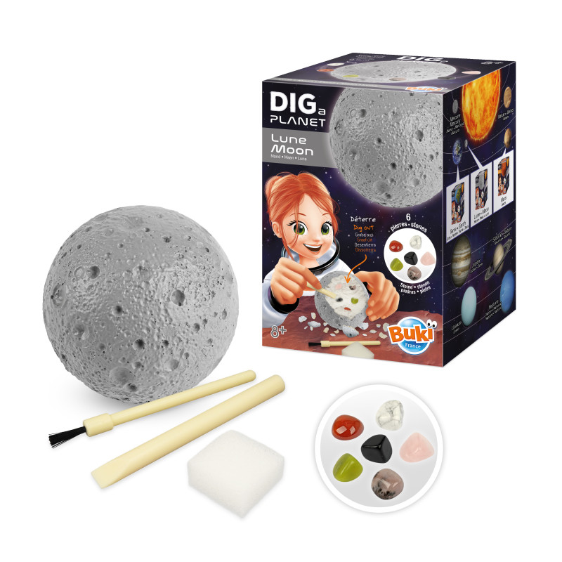 Avec les outils, creuse la Lune et déterre 6 véritables pierres dont du quartz rose, une obsidienne et une cornaline.Notice illustrée en couleurs.Dès 8 ans.