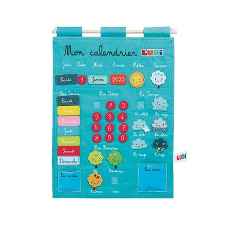Voyagez dans le temps, jour après jour !Ce calendrier mural en tissu brodé aide les enfants à comprendre et à maîtriser le passage du temps. Grâce à ses éléments amovibles en feutrine, les petits curieux pourront s'amuser à découvrir les jours de la semaine, les mois, les saisons, et même la météo du jour !Apprendre devient un jeu d'enfant !Guidés par leurs parents, les enfants apprendront en s'amusant à chaque étape, renforçant ainsi leur confiance en eux et leur autonomie. Chaque matin devient une aventure excitante pour se préparer à la journée qui vient !Un Design Astucieux et LudiqueCe calendrier, avec son tissu doux et brodé, est conçu pour être accroché facilement au mur grâce à sa baguette en bois. Les étiquettes amovibles en scratch sont parfaitement adaptées aux petites mains, permettant aux enfants de manipuler les éléments en toute simplicité. Et pour encore plus de praticité, des poches de rangement sont intégrées pour que chaque élément amovible ait sa place, évitant ainsi tout désordre !Des éléments interactifsLe calendrier comprend tout ce qu'il faut pour se repérer dans le temps : 12 mois, 7 jours, 4 saisons, 6 années, 12 chiffres et 5 climats. De quoi s'amuser toute l'année !CaractéristiquesÉgalement disponible en rose.Dimensions : 40 x 53 x 1 cm.Matière : 100% Coton.Lavable avec un chiffon humide. Séchage à plat.Adapté pour les enfants à partir de 3 ans.Petits éléments : danger d'étouffement.