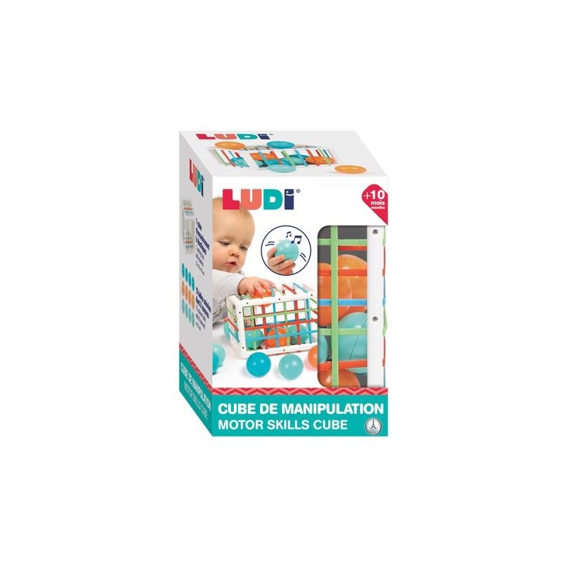 Un jeu d'encastrement original !Découvrez un cube décoré d’élastiques entremêlés et 12 petites balles de couleurs toniques aux sons rigolos. Les enfants s’amusent à introduire les balles dans le cube à travers les élastiques colorés, puis à les retirer. Ce jeu original est basé sur l’apprentissage par l’expérience. Quelle satisfaction de réussir à tout ranger dans le cube ! Un défi moteur pour les plus petitsCe jeu aéré et coloré attise l’intérêt des enfants. Les faces ouvertes du cube, reliées par des élastiques tendus, sont très faciles à agripper.Les enfants travaillent leur dextérité et leur force pour faire entrer les 12 balles à travers les élastiques. Ils usent ensuite de stratégie pour essayer de les sortir. En manipulant le cube, les enfants découvrent qu’il y a des faces plus faciles que d’autres pour laisser entrer les balles.Saisir, pousser, tirer, se faufiler… Ce jeu stimule la préhension des enfants mais aussi leur logique tout en tonifiant leur motricité. La réussite de l’encastrement félicitée par l’approbation des parents permet aux enfants de développer la confiance en soi et leur vocabulaire.En grandissant, les enfants apprennent à reconnaître les couleurs et à compter. Accompagnés de leurs parents, les petits s’amuseront à trouver le nombre de balles entrées dans le cube et celles qui restent à introduire. Imaginez des challenges ou des jeux collaboratifs ! Les enfants adorent trouver de nouvelles activités pour jouer avec leurs jouets préférés !Un jouet bien penséLes 12 balles aux couleurs vives attirent l’attention des enfants. Ces balles de jeu ont une taille adaptée aux petites mains de bébé qui peut les manipuler facilement. Les 4 balles orange sont légères et souples mais résistantes : votre enfant peut les écrabouiller à volonté, elles reprendront leur forme initiale. Les 8 balles bleues, en plastique dur, émettent un petit bruit de maracas qui éveille l’acuité sonore des enfants. Adapté pour les enfants de plus de 10 moisDimensions du cube : 18 x 12 x 12 cmDimensions des balles : ø 4,5 cmComposition : ABS (Acrylonitrile Butadiène Styrène) et PE (polyéthylène)Lavable avec un chiffon humide