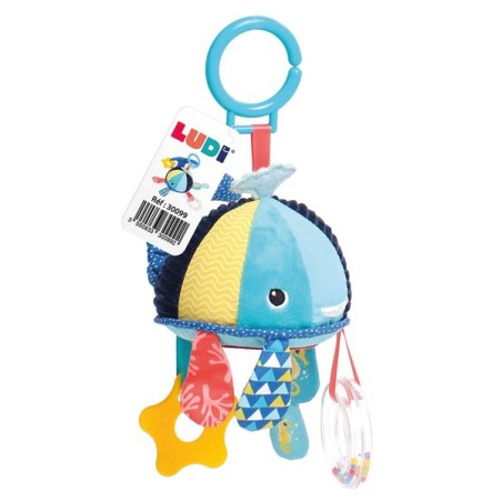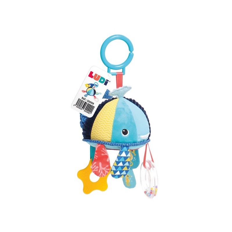 Activité suspendue c'est rigolo !Cette baleine d’activités à suspendre est un jouet d’éveil que l’on peut accrocher partout.Avec plusieurs activités sensorielles : jeu sonore, papier froissé, un anneau de dentition et un miroir pour que bébé puisse s’amuser.La baleine et ses activités suspendues amuseront bébé et stimulent les sens et la motricité fine et la préhension.Adapté pour les enfants de plus de 3 mois.Composition 100 % polyester .Nettoyage simple avec un chiffon humide.