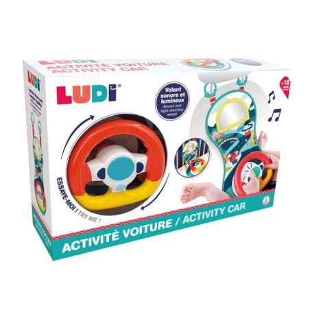 Grand panneau d'activités pour occuper bébé pendant les longs trajets de voiture. Bébé pourra s'amuser à faire semblant de conduire comme les grands. Un volant sonore et lumineux pour encore plus de je