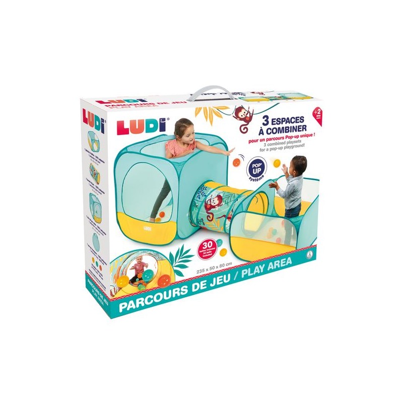 Un grand parcours de jeu pour s’amuser à deux ou trois ! Un cube, un tunnel sur le thème de la jungle et une aire de jeu à balles : 3 espaces à utiliser seuls ou à combiner pour former un parcours pop-up unique... On joue comme on veut ! Sa