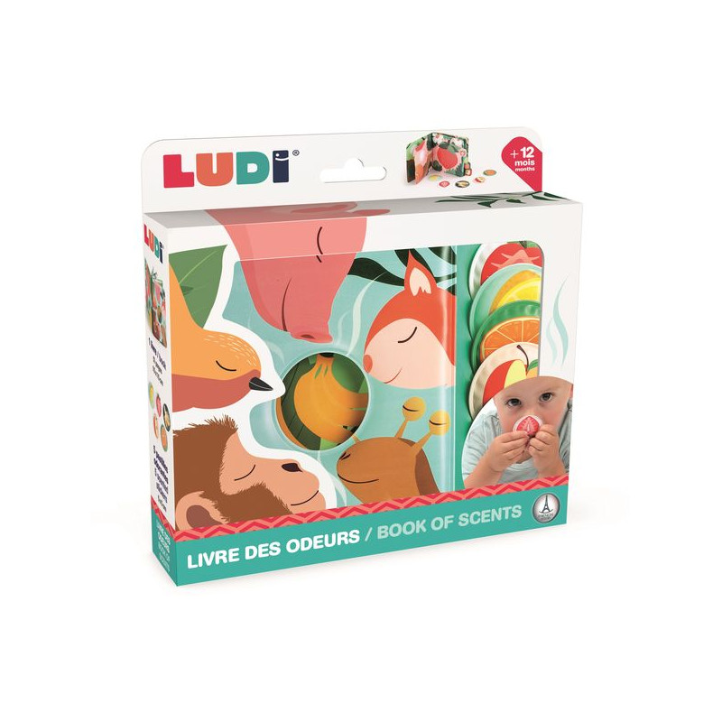 Un Livre Sensoriel et Ludique pour Découvrir les FruitsOffrez à votre enfant une expérience de lecture originale qui stimule les sens et l’imaginaire. Ce livre interactif allie découverte, apprentissage et plaisir grâce à ses illustrations colorées et ses parfums fruités.Une Lecture Qui Éveille les SensChaque page invite l’enfant à explorer la nature aux côtés d’animaux amusants présentant leur fruit préféré. Surprise : une douce odeur se dégage du livre, rendant la lecture encore plus immersive et captivante. Un moyen ludique d’apprendre le nom des fruits, des couleurs et des animaux tout en enrichissant son vocabulaire.Un Jeu d’Association pour Apprendre en S’AmusantLe livre est accompagné de cinq vignettes parfumées représentant des tranches de fruits (pêche, orange, fraise, pomme et raisin). En frottant son doigt sur la vignette, l’enfant découvre un parfum et doit l’associer au bon fruit en le fixant grâce à un scratch. Un excellent exercice pour stimuler la mémoire olfactive et renforcer l’apprentissage par le jeu.Un Livre Adapté aux Petites MainsAvec ses pages épaisses et ses pastilles détachables, ce livre est conçu pour être facilement manipulé par les tout-petits. Il favorise l’éveil sensoriel et accompagne l’enfant dans sa découverte du monde qui l’entoure.Caractéristiques :Dès 12 moisDimensions : 15 x 15 x 3,5 cmDiamètre des pastilles : 5 cmEn PEVA.Lavable avec un chiffon humide à l'eau.
