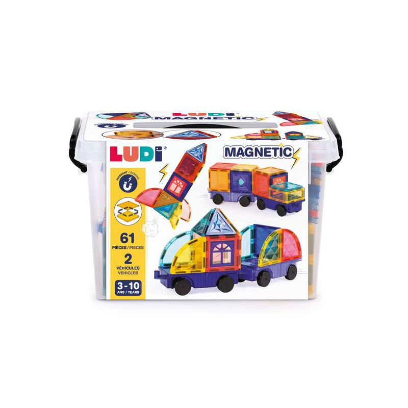 Des constructions roulantes et colorées ! À vos marques, prêts… construisez ! Avec la valisette Véhicules Magnétiques LUDI, les enfants dès 3 ans s’inventent un monde de véhicules extraordinaires à créer, démonter et reconstruire à l’infini. Un jeu de construction ludique, intelligent et haut en couleurs pour stimuler la créativité et découvrir les formes en 3D !Construis, invente, transforme !Ce coffret généreux contient 63 pièces aimantées aux formes variées, parfaites pour réaliser des constructions en 2D sur une surface plane ou en 3D pour un effet waouh garanti ! Grâce à deux bases de véhicules à roulettes, les enfants peuvent assembler leurs créations pour former des trains, camions, voitures, fusées et bien plus encore. Chaque assemblage devient un nouveau défi pour l’imagination !Les pièces transparentes et colorées créent un superbe effet kaléidoscope lorsqu’elles sont exposées à la lumière. Ce jeu de lumière renforce l’attrait visuel et stimule la perception spatiale. Empiler, imbriquer, connecter… tout devient possible !Un jeu d’éveil pour petits bâtisseurs curieuxEn jouant avec les formes géométriques aimantées, les enfants développent naturellement leur coordination œil-main, leur logique et leur compréhension des volumes. C’est aussi une excellente manière d’aborder les premiers principes d’assemblage et de construction tout en s’amusant. Solide, accessible et évolutif, ce jeu peut s’utiliser seul ou à plusieurs, pour partager des moments de création en famille ou entre copains.Un format pratique à emporter partoutL’ensemble est livré dans une valisette rigide de rangement, idéale pour ne rien perdre et emporter le jeu partout avec soi : en vacances, chez les grands-parents ou simplement d’une pièce à l’autre ! Les pièces sont légères, durables et conçues pour résister à l’enthousiasme des jeunes constructeurs.Caractéristiques : Adapté aux enfants à partir de 3 ansContient 63 pièces magnétiques dont 15 carrés / 8 quarts de cercles / 10 rectangles / 20 triangles / 4 fenêtres / 2 bases de véhiculesDimensions des carrés : 7,5x7,5 cmComposition : 100% Méthacrylate de méthyle-acrylonitrile-butadiène-styrène (MABS)Lavable avec un chiffon humide.