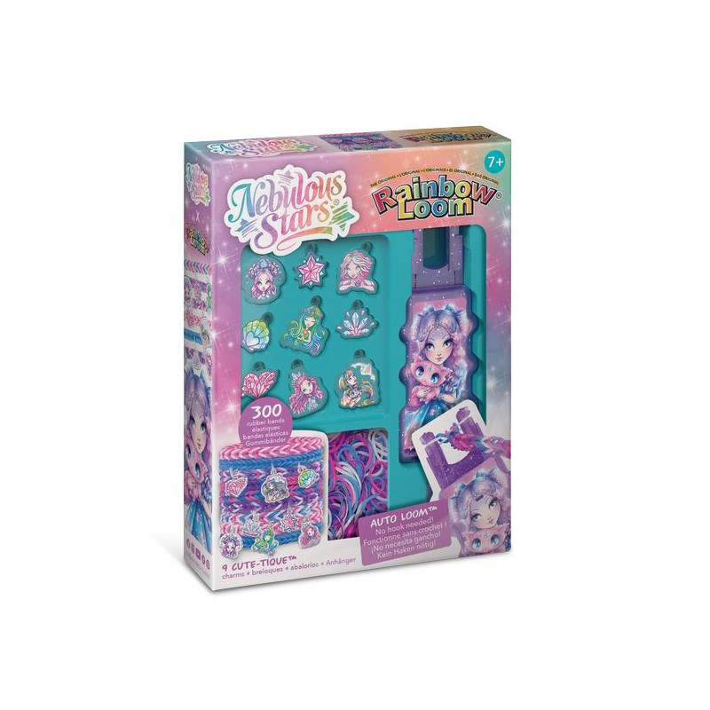 Fabrique facilement de magnifiques bracelets élastiques Nebulous Stars grâce au métier à tisser Auto Loom™ de Rainbow Loom®. L’ensemble comprend 300 élastiques et 9 breloques à l’effigie de tes Stars préférées !
