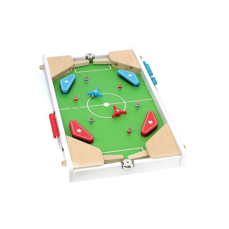 Qui n'a pas voulu avoir un flipper ou un baby-foot chez soi ? Ce flipper est un mélange des deux ! C'est parti pour des parties de folie, le match de football peut commencer.Une chochette dans chaque camp sonne quand un but est marqué ! Comme sur un vrai baby-foot, un boulier sur le côté permet de comptabiliser les points.Il faudra faire preuve de dextérité pour faire tourner les helices et éviter les joueurs pour remporter la partie.Livré avec plusieurs balles en métal, ce flipper de table compact ravira les petits et les grands.