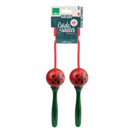 Corde à sauter en bois laqué en forme de coccinelle. Fabrication française.