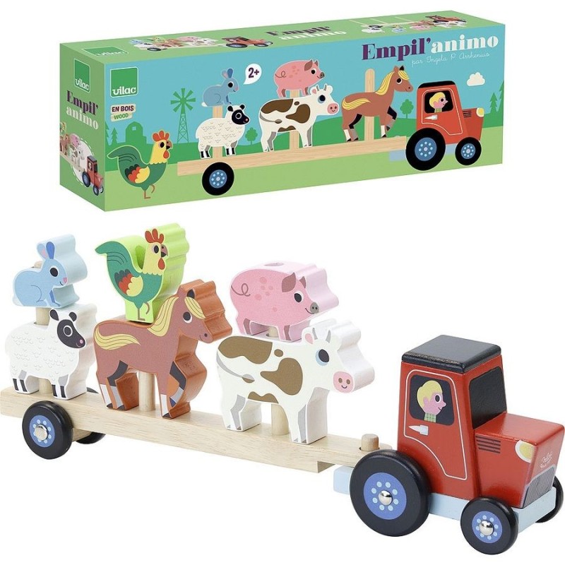 De jolis animaux en bois à empiler sur la remorque du tracteur. Illustré par Ingela P.Arrhenius. À partir de 2 ans.