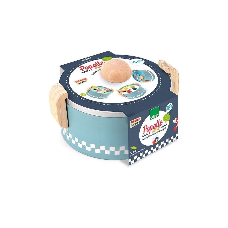 Quelles surprises dans cette popotte minus !Un jeu d'éveil en forme de popotte pour cuisiner. En dévissant le couvercle, les petits découvrent 3 plateaux d'activité interchangeables : un poisson, du poulet et une crevette à encastrer sur un étage, 5 légumes à glisser dans la forme correspondante dans un autre plateau et enfin 5 petites carottes multicolores à planter suivant leur couleur aux bons emplacements dans le dernier plateau.L'enfant peut ainsi développer son sens de l'observation, exercer sa motricité tout en s'amusant à faire comme les grands, ça sent bon chef !