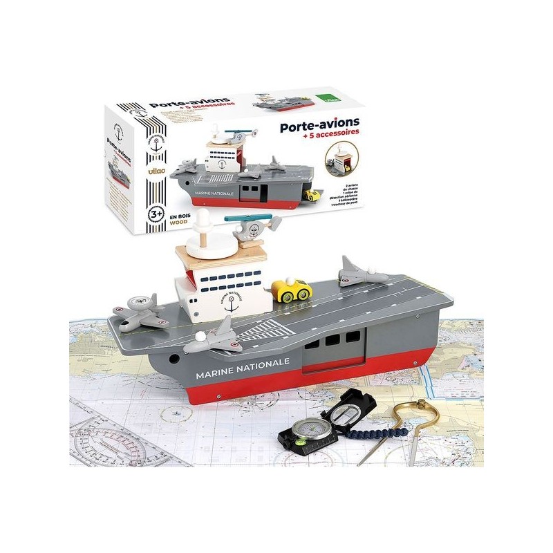 Plus original que le traditionnel garage, voici le porte-avions en bois Vilac X Marine nationale. Avec ses nombreux aéronefs et son ascenseur qui permet de les faire descendre dans la coque, les enfants n’ont pas fini de s’émerveiller ! Faites embarquer l’imagination de vos enfants pour de palpitantes aventures avec le porte-avions en bois Vilac X Marine nationale ! Il est livré avec deux avions de chasse, un avion de détection aérienne, un hélicoptère et un tracteur de pont. Les ailes des aéronefs se plient pour qu’ils puissent entrer dans le château du bâtiment, dans lequel se cache un ascenseur. Les enfants peuvent ainsi les faire descendre dans la coque, puis les récupérer grâce aux ouvertures situées à l’arrière et sur le côté du porte-avions. Entretenir, conduire, catapulter, voler, apponter… Une chose est sûre : ces missions ne manqueront pas de sel !Un jouet pour les enfants âgés de 3 ans et plus.