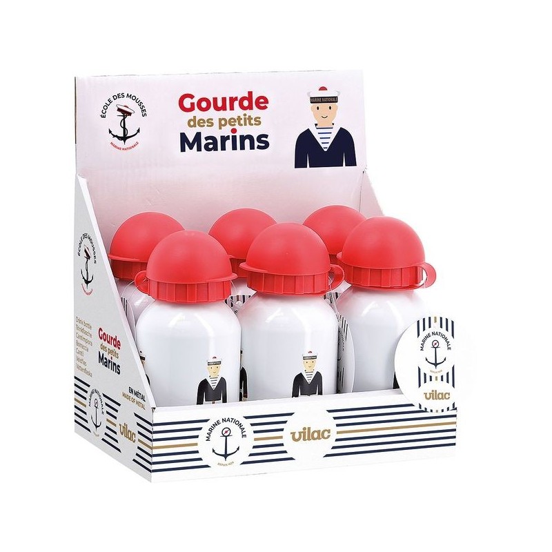 Un bouchon rouge comme un pompon pour être facilement repérée, de l’aluminium pour résister à l’oxydation et un joli décor pour apporter une touche de fantaisie : voici la gourde pour enfant « Ecole des mousses » Vilac X Marine nationale.En faction tout autour de la gourde « Ecole des mousses », les matelots de la Marine nationale tiennent les boissons de vos enfants sous bonne garde ! Un joli décor rehaussé par le rouge du bouchon qui évoque les pompons des bâchis.La gourde « Ecole des mousses » Vilac X Marine nationale a été étudiée pour être facilement utilisable par les enfants. Sa contenance de 300 millilitres leur permet de l’emporter partout avec eux, tandis que l’aluminium lui donne une bonne solidité et une excellente durabilité. Le goulot de la gourde, protégé des saletés par un bouchon, est en plastique pour être facilement nettoyable.
