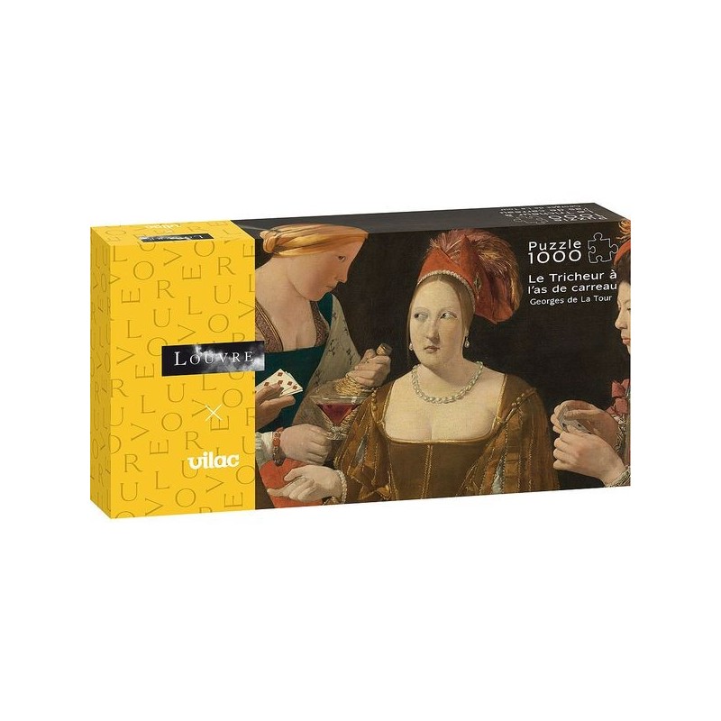 Nous sommes très heureux de collaborer avec le musée du Louvre sur une large gamme de jeux et jouets qui mettent en lumière les formidables collections du plus beau musée du monde !Serez-vous assez patient pour venir à bout de ce puzzle 1000 pièces en carton "Le tricheur à l‘as de carreau", tableau de Georges de La Tour peint vers 1636 ?Cette œuvre porte bien son nom car elle nous donne à voir une scène de tricherie avec trois personnages qui s'apprêtent à faire perdre la partie de jeu à un jeune homme naïf.Pendant que la joueuse complice au centre a l’index pointé vers le personnage de gauche qui récupère discrètement un as de carreau placé derrière son dos, la servante surveille la victime qui perdra probablement ses précieuses pièces en or sur la table à la fin de la partie du jeu de la prime, jeu proche du poker d'aujourd'hui.