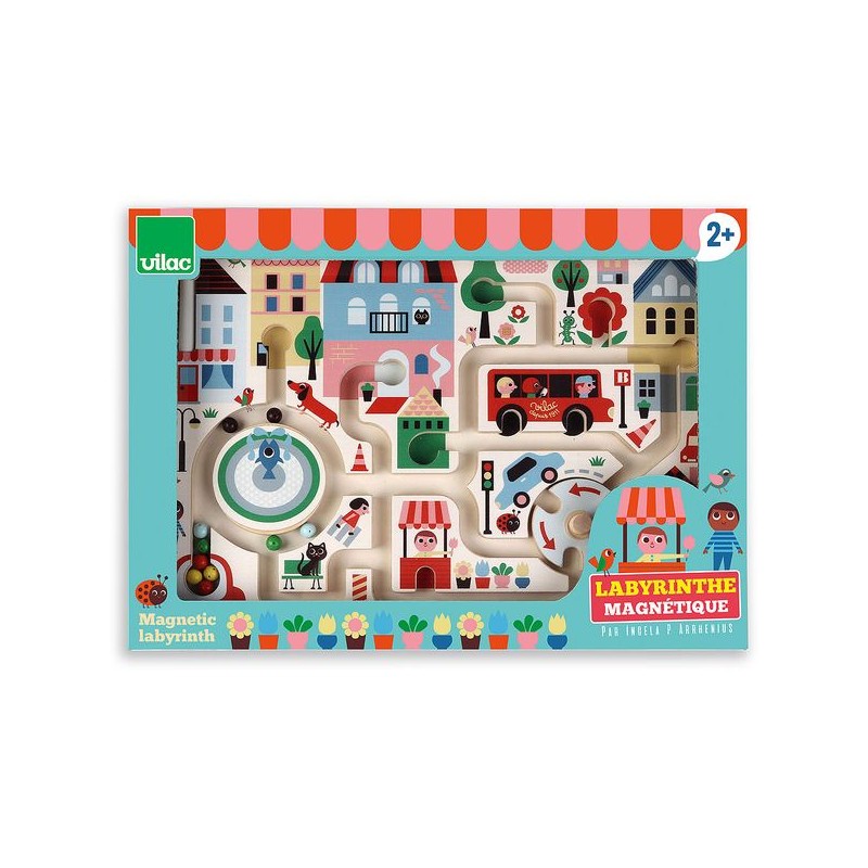 Bienvenue dans l'univers poétique et vintage d'Ingela P. Arrhenius. Grâce à un petit stylet magnétique, les enfants font voyager les billes de couleur dans cette magnifique ville. Une bille verte dans un arbre, une rouge dans la fleur, deux autres dans les roues du bus, arriverez-vous à toutes les placer ? C'est encore plus rigolo en passant par le rond-point qu'il faut actionner ! Un jeu en bois ludique qui facilite l'acquisition de la motricité fine des petits, leur permet de se repérer dans l'espace et enrichi leur vocabulaire en nommant les couleurs, les animaux et objets.