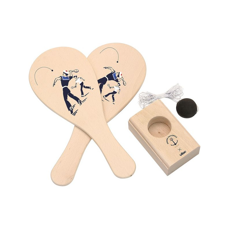 3… 2... 1… décollage de l'avion de chasse ! Le pilote est parti en mission, catapulté du pont de son porte-avion, le Charles de Gaulle. Le pont du navire est à nouveau silencieux, deux marins profitent de cette acalmie pour empoigner leurs raquettes et commencer une partie endiablée de tennis. Une, deux, trois balles finissent à l'eau... il faut faire quelque chose Capitaine ! C'est ainsi qu'a vu le jour le premier jeu de jokari, inventé par le Capitaine Vilac qui eu l'idée lumineuse d'attacher la balle à un très grand élastique afin qu'aucune balle ne tombe à nouveau à l'eau. Fabriqué dans notre atelier du Jura en France, ce beau jeu de jokari en bois a été créé en partenariat avec la Marine nationale. A toi de jouer matelot !