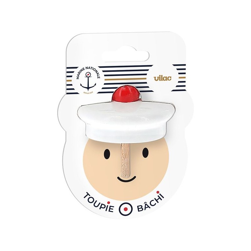 Le bâchi est le nom donné à la coiffe qui est portée du matelot au quartier-maître. A partir du grade de second-maître, il porte une casquette. Dans la Marine nationale française, le bâchi est surmonté d'un pompon rouge. Créée en partenariat avec la Marine nationale, cette toupie originale en bois tourne sur son pompon mais peut également tenir sur sa tige si vous êtes habile. Cette toupie en bois laqué est fabriquée dans notre atelier du Jura suivant un savoir-faire ancestral.