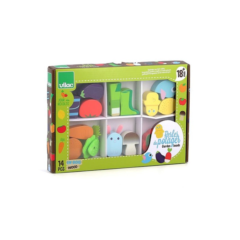 Première activité manuelle.Ce jeu de perles en bois à enfiler est l’un des premiers jeux créatifs que vous pouvez proposer à votre bébé à partir de 18 mois. Avec ses petits doigts, votre enfant va devoir faire preuve de dextérité pour créer une jolie ribambelle de perles. A la fin du jeu, hop, rangez toutes les pièces à l’intérieur de la boîte en carton joliment décorée sur le thème du potager.Jeu 2 en 1 : perles en bois et figurines.Les plus petits peuvent inventer mille et une histoires et plonger dans le monde du potager grâce aux figurines en bois : légumes, fruits, animaux de la ferme seront de parfaits compagnons de jeu. Les plus grands quant à eux pourront s’amuser avec les figurines qui vont se transformer en perles à enfiler sur le cordon de tissu. Ce dernier possède des clips de sécurité, ce qui rend ce premier jeu d’éveil adapté aux plus jeunes.Jeu Montessori.Ce jeu composé de grosses perles en bois va aider votre enfant à développer sa motricité fine, sa coordination œil-main et son évaluation des distances entre l’objet à enfiler et le support. Réussir à enfiler des perles sur un support démontre que votre petit vient de franchir un cap dans son développement. Il comprend que les perles disposent d’un trou et qu’elles peuvent être enfilées sur le cordon en tissu : il développe ses capacités d'observation et d’analyse.