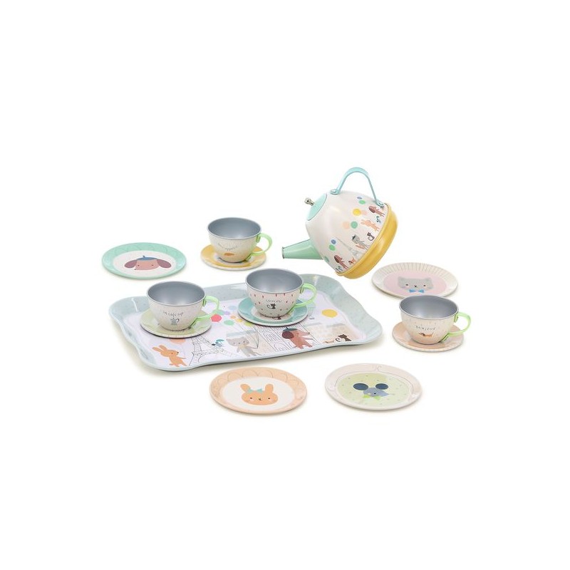 Vilac a conçu cette dinette musicale en métal tout en douceur et poésie, pour les enfants à partir de 3 ans. Une théière magique joue le thème "Happy birthday" quand on la penche pour servir le thé comme les grands. Le format de cette dinette est parfait pour les petits et les grands. Les accessoires sont robustes et légers avec une finition soignée. Les 14 accessoires sont illustrés par Sarah Betz avec des couleurs tendres évoquant la ville de Paris. Un jouet ludique qui aidera les enfants à développer leur motricité fine, leur imagination et leur sociabilisation. Ce jouet ne nécessite pas de piles, la musique est jouée par une boîte à musique mécanique qui se remonte avec une clé fixée sous la théière.