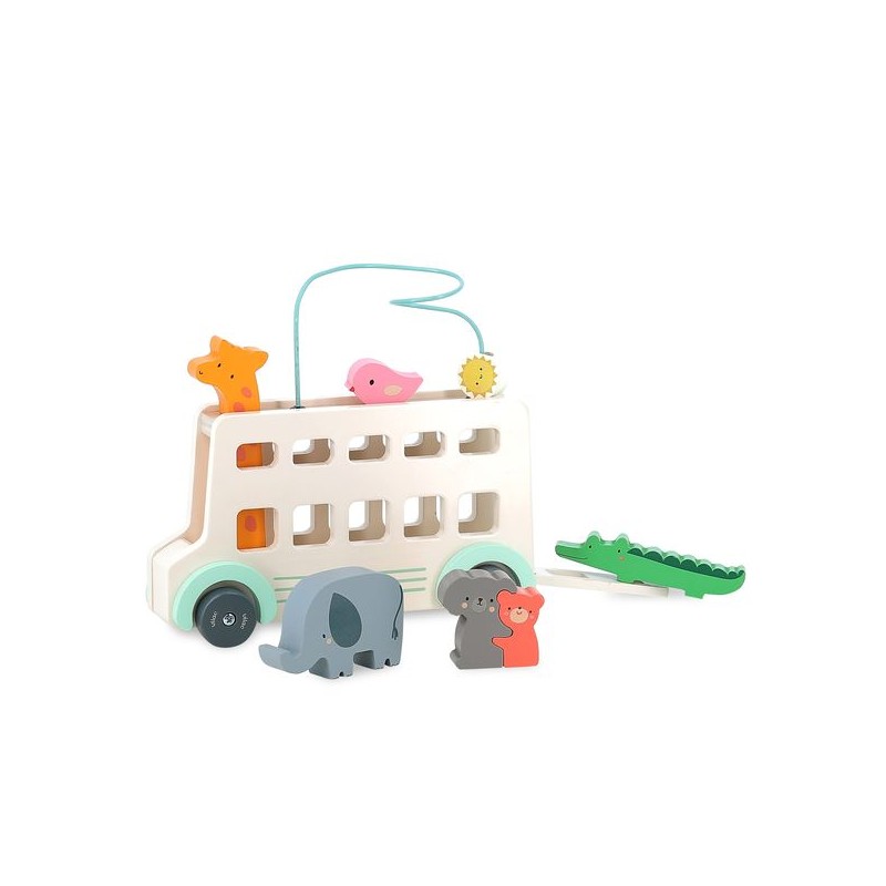 Montez à bord de cet autobus tout mignon, créé par l'équipe de designers de Vilac en collaboration avec l'illustratrice Sarah Betz. Craquez pour ce jouet d'éveil qui accompagnera les premiers gestes de votre petit pour développer son imagination et sa motricité fine. Il pourra appuyer sur la tête de la girafe pour entendre un petit klaxon, déplacer le soleil sur son fil et placer le petit oiseau sur le toit. Ouvrez la porte pour découvrir un éléphant et les amis koala et ours qui se font un gros câlin ! Ce bus d'éveil en bois trouvera aussi sa place comme douce et poétique décoration dans la chambre de votre enfant.