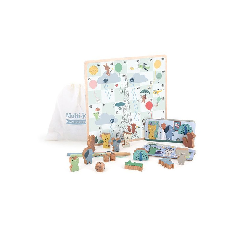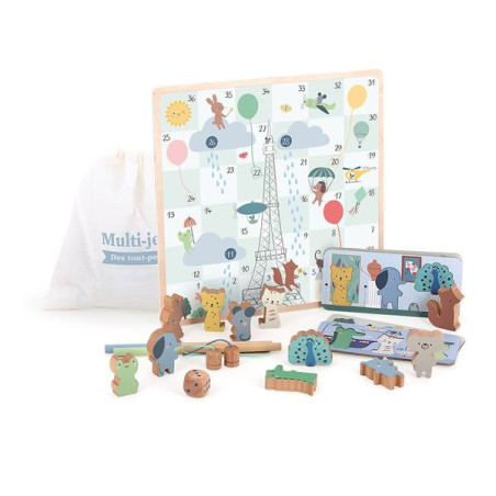 Un coffret multi-jeux en bois pour l'éveil de votre enfant. Offrez à votre enfant dès 2 ans notre coffret multi-jeux de société en bois, illustré par l'artiste Sarah Betz. Composé de quatre jeux classiques - le jeu de l'oie, le jeu des échelles, la pêche à la ligne, et un jeu de loto - ce coffret est idéal pour éveiller la curiosité de votre tout-petit. Les illustrations colorées et attrayantes vont attirer son attention, l’encourageant à explorer, apprendre les règles, et à découvrir de nouvelles façons de jouer, tout en s'amusant. Développement des compétences motrices et cognitives. Notre coffret multi-jeux est conçu pour stimuler le développement des compétences motrices et cognitives de votre enfant. Le jeu de l’oie et le jeu des échelles vont l’aider à apprendre à lancer le dé, à compter les cases, et à suivre les règles, ce qui favorise l’apprentissage des chiffres et de la logique. La pêche à la ligne permet de travailler la coordination œil-main et la dextérité, tandis que le jeu de loto développe la mémoire visuelle et la concentration. Chaque jeu de ce coffret offre à votre enfant une expérience éducative complète, qui l’aide à progresser de manière ludique. Un moment de partage. Notre coffret multi-jeux de société va également permettre de partager des moments de complicité en famille. En jouant ensemble, votre enfant apprend à respecter les règles, à attendre son tour, et à gérer les petites victoires et défaites, ce qui favorise le développement de ses compétences sociales. Ce coffret multi-jeux devient alors un outil d'apprentissage précieux pour votre enfant, tout en offrant des moments de rire, d'échange, et de complicité avec vous, créant ainsi des souvenirs inoubliables autour de jeux éducatifs et amusants. Un univers délicat. Ce coffret multi-jeux est joliment illustré par l’artiste Sarah BETZ. Elle a rejoint l’aventure Vilac en 2023, et propose un univers tendre et poétique. Illustratrice de talent, elle n’a jamais quitté cette âme d’enfant proche de la nature qui continue de l’inspirer aujourd’hui. Elle a fondé son studio d’illustration Cubeely dans le quartier pittoresque de Montmartre en 2013.