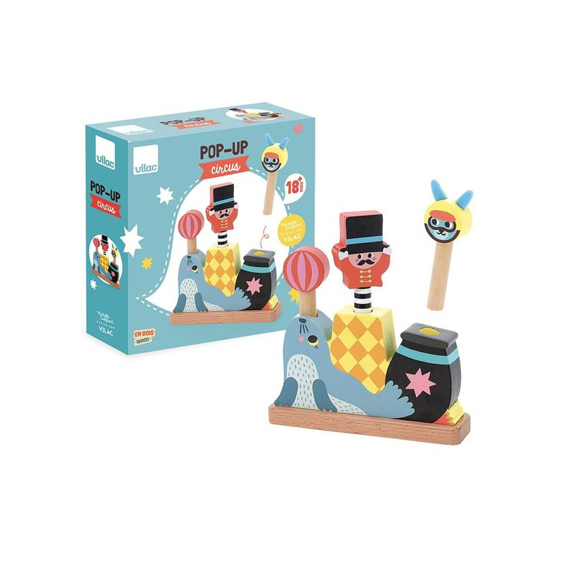 Un jouet en bois surprenant. Notre pop-up en bois est une merveille d’ingéniosité et de simplicité qui va enchanter les petits comme les grands. Fabriqué en bois, ce jouet est écologique mais aussi robuste, ce qui en fait un compagnon de jeu idéal pour les enfants à partir de 18 mois. Sa conception astucieuse va vous surprendre : en appuyant sur la tête des personnages, ces derniers sautent et s’échappent du cirque. En manipulant les personnages, votre enfant va développer sa motricité fine et va apprendre intuitivement les concepts de cause à effet. « Si j’appuie sur le bonhomme de neige, il va sauter en l’air ». De plus, l’aspect ludique du support en forme de cirque, va encourager son imagination et favoriser le jeu imaginatif. Un jouet en bois. Comme les petits à partir de 18 mois sont de véritables aventuriers, notre pop-up est en bois, ce qui les rend très résistant aux différents chocs. La peinture utilisée est évidemment non toxique pour les petits qui mettent encore tout à la bouche à cet âge. L'univers très ludique et coloré de ce jeu d’éveil ravira tous les bout'choux. Un univers tout doux. Ce jeu d’éveil est délicatement décoré par l’artiste Michelle Carlslund. Elle fait partie de la famille VILAC depuis de nombreuses années, et propose un univers doux et élégant. Illustratrice indépendante inspirée par tout ce qui l’entoure, ses créations sont tendres et poétiques, et son univers enfantin et stylisé se marie parfaitement à celui de nos jouets.