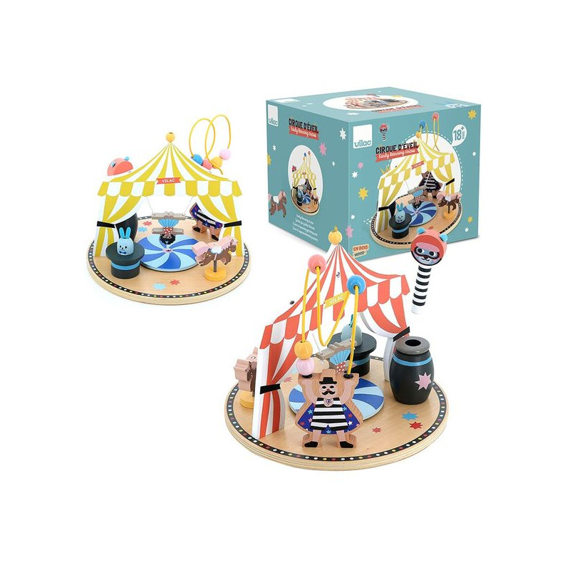 Un jouet en bois surprenant. Notre cirque en bois est une merveille d’ingéniosité et de simplicité qui va enchanter les petits comme les grands. Fabriqué en bois, ce jouet est écologique mais aussi robuste, ce qui en fait un compagnon de jeu idéal pour les enfants à partir de 18 mois. En manipulant les personnages, votre enfant va développer sa motricité fine et va apprendre intuitivement les concepts de cause à effet. « Si j’appuie sur le bonhomme de neige, il va sauter en l’air ». De plus, l’aspect ludique du support en forme de cirque, va encourager son imagination et favoriser le jeu imaginatif. Favoriser la motricité fine des tout-petits. Notre jouet d’éveil Circus encourage la motricité fine et la coordination main-œil des enfants. Il propose 6 activités très ludiques : une partie jouet à fil avec un jongleur, un lapin magique pouet-pouet, une acrobate, une piste illusion d’optique, un cheval sur ressort et un ours cascadeur. Ses couleurs acidulées et ses détails adorables captivent l’attention, stimulant la reconnaissance des formes et des nuances, tout en développant la coordination des tout-petits. Encouragez l’épanouissement de votre enfant à travers ce jouet en bois, conçu avec soin pour stimuler son imagination. Un jouet d’éveil en bois ludique. En manipulant les pièces, votre enfant va développer différentes capacités : coordination, motricité fine, concentration, association cause à effet. De plus, vous pourrez lui faire découvrir l’univers du cirque en nommant chaque personnage. Notre jouet d’éveil en bois est parfait pour grandir en s’amusant ! Offrir un jouet en bois, c’est proposer un jouet durable, solide, offrant une texture naturelle agréable au toucher. Un univers tout doux. Ce jouet d’éveil en bois est dessiné avec poésie par l’artiste Michelle CARLSLUND. Elle fait partie de la famille VILAC depuis de nombreuses années, et propose un univers doux et élégant. Illustratrice indépendante inspirée par tout ce qui l’entoure, ses créations sont tendres et poétiques, et son univers enfantin et stylisé se marie parfaitement à celui de nos jouets.