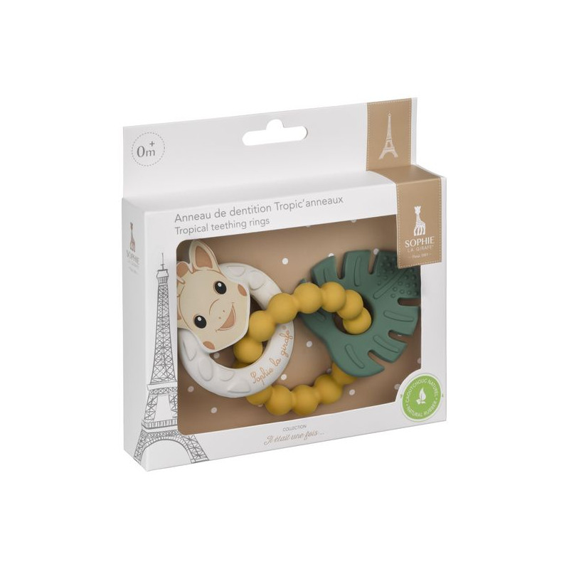 Fabriquées en caoutchouc naturel, ces 3 bagues colorées aux textures et niveaux de fermeté variés sont parfaites pour soulager les douleurs de dentition des bébés :•Textures variées : points, bulles, motifs•2 niveaux de fermeté : une bague creuse et souple avec la tête de Sophie, et deux bagues solides, plus fermes et colorées.Sa forme ergonomique permet aux petites mains de la saisir facilement.