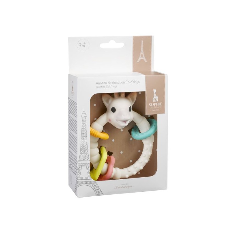 Un anneau de dentition coloré aux multiples textures! Sain et naturel, cet anneau de dentition est composé de caoutchouc 100% naturel, tiré de la sève de l’hévéa et de peinture alimentaire. Doté de nombreuses parties souples à mordiller et aux textures variées (picots, stries, oreilles et cornes de Sophie), il offre différents massages et soulage efficacement les gencives de bébé. Ces 4 formes géométriques aux couleurs vivent attirent le regard de bébé qui s’amuse à les faire coulisser autour de l’anneau principal. Léger et ergonomique, il est facile à saisir et à manipuler pour les petites mains