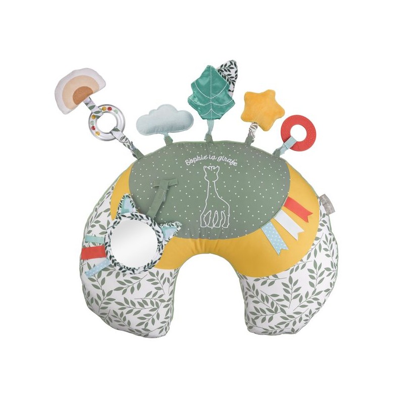 Le coussin d'éveil propose de nombreuses activités à découvrir : un hochet, un jouet en papier qui couine, une clochette, un anneau d'éveil, un miroir et une étiquette colorée.