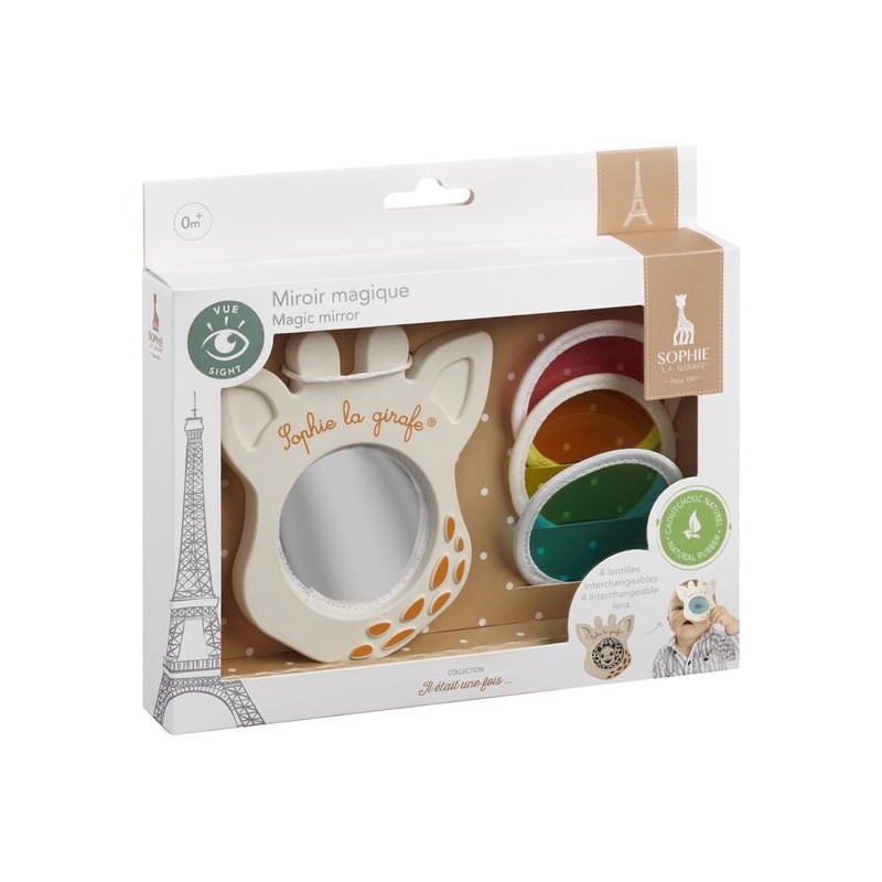 Un miroir magique pour stimuler la vision de bébé de la naissance à 24 mois ! Ce miroir évolutif est composé d'une monture en caoutchouc 100% naturel et de 4 verres interchangeables pour développer la vision de bébé : Dès ses premiers mois avec les contrastes noir et blanc. Vers 3 ou 4 mois, bébé découvre son reflet dans le miroir. Enfin, vers 1 an, bébé découvre la vie en couleurs grâce aux 3 lentilles colorées transparentes bleu, jaune et rose.