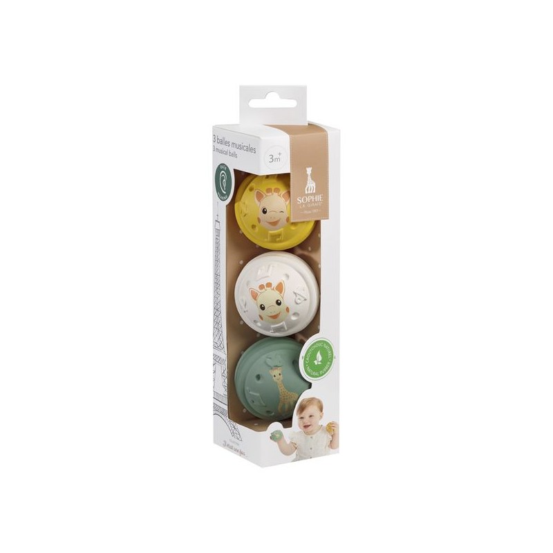 3 balles musicales aux sons différents pour stimuler l'ouïe de bébé ! Fabriquées à partir de caoutchouc 100% naturel, ces 3 boules musicales sont légères et faciles à manipuler !3 actions pour activer 3 sons différents :- En pressant doucement la boule verte, bébé entendra le doux bruit du papier qui craque.- Secouer la boule blanche fait sonner une cloche.- En appuyant brièvement sur la boule jaune, le fameux « pouet » de Sophie retentit !Bébé développe son ouïe et découvre et comprend le concept de causalité.