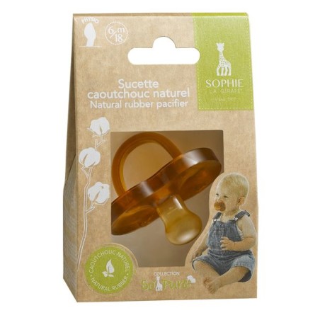 Saine et douce pour le visage de bébé, cette sucette est entièrement fabriquée à partir de caoutchouc 100% naturel : téterelle, collerette et anneau.
