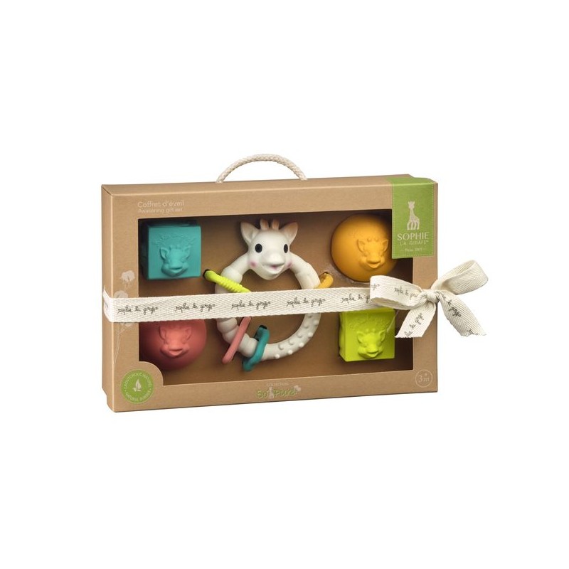 Un coffret cadeau amusant pour développer les sens de bébé ! Le coffret contient deux produits en caoutchouc 100% naturel : Colo'rings : un anneau de dentition aux textures différentes à mâcher pour soulager les gencives douloureuses ; 2 balles et 2 blocs : Bébé développe naturellement sa motricité fine en déplaçant, attrapant, empilant ou lançant ces blocs et balles.